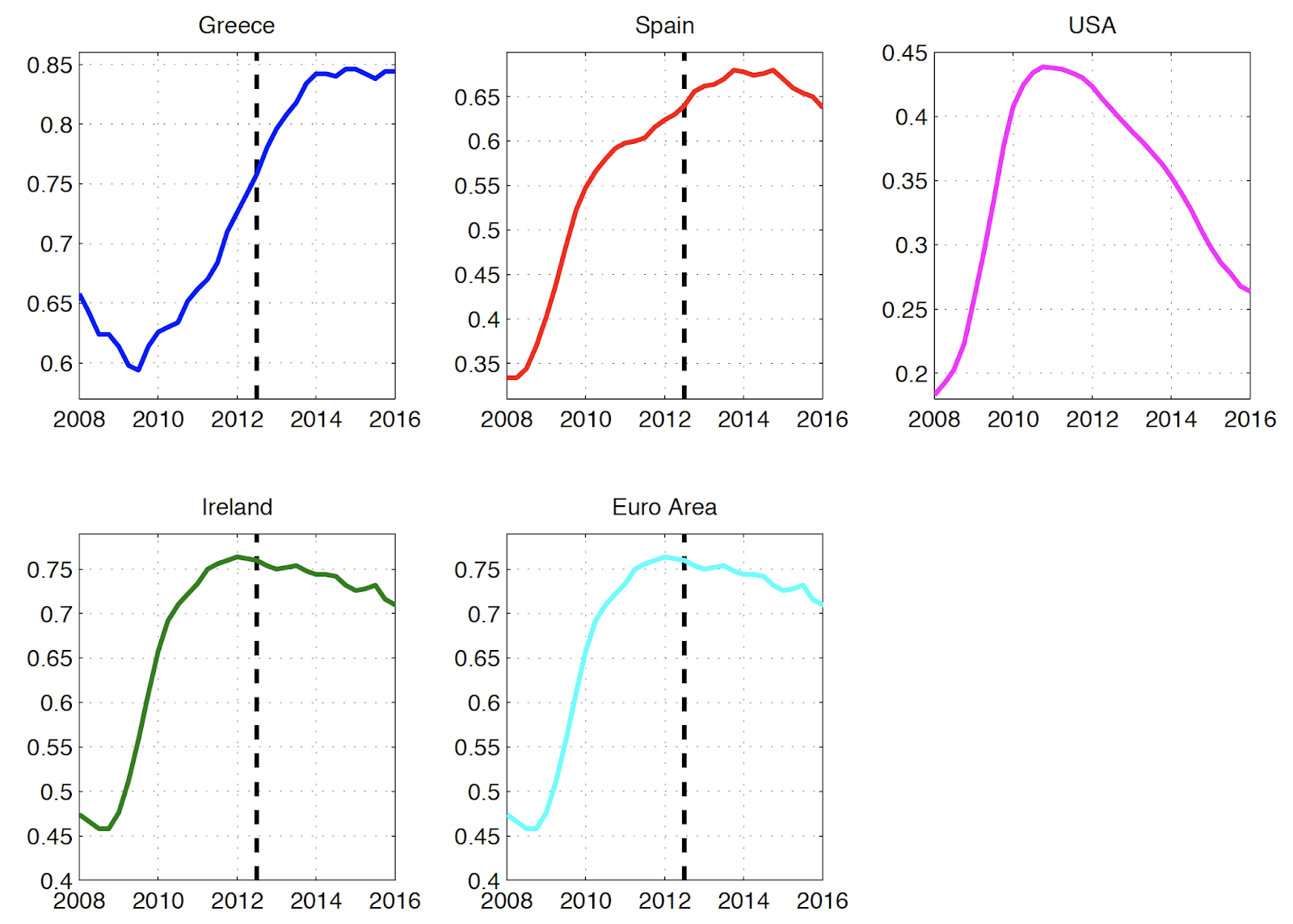 The dashed-line indicates the timing of Draghi’s “whatever it takes” speech.