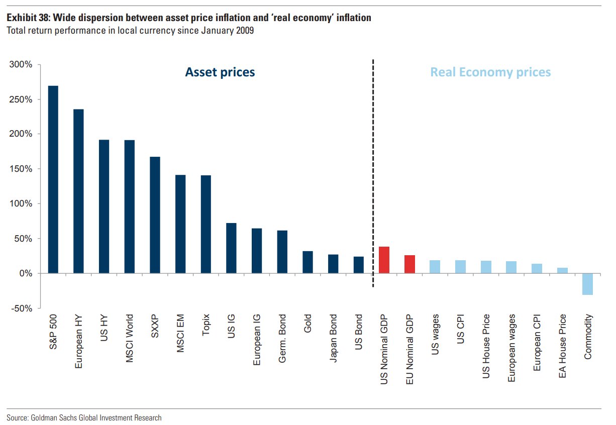The range of total returns (unadjusted for differential FX rates) for some key assets categories since 2009 via Goldman Sachs Research: