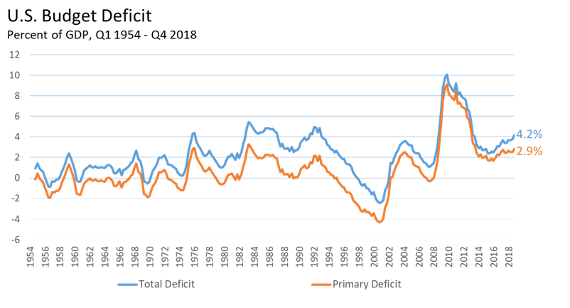 The U.S. federal budget deficit for 2018 came in just shy of $800 billion, or about 4% of the gross domestic product (the primary deficit, which excludes the interest expense of the debt, was about 3% of GDP).