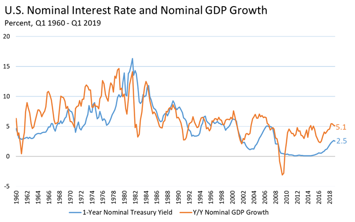 Let R denote the gross yield on debt (so that R – 1 is the net interest rate). If we interpret D as currency, then R = 1 (currency has a zero net yield). If we interpret D as U.S. Treasury debt, then R = 1.025 (UST debt has an average net yield of around 2.5%). Note that in some jurisdictions today, government debt has a negative yield (so, R < 1 ) — that is, government “debt” is in this case an income-generating asset!